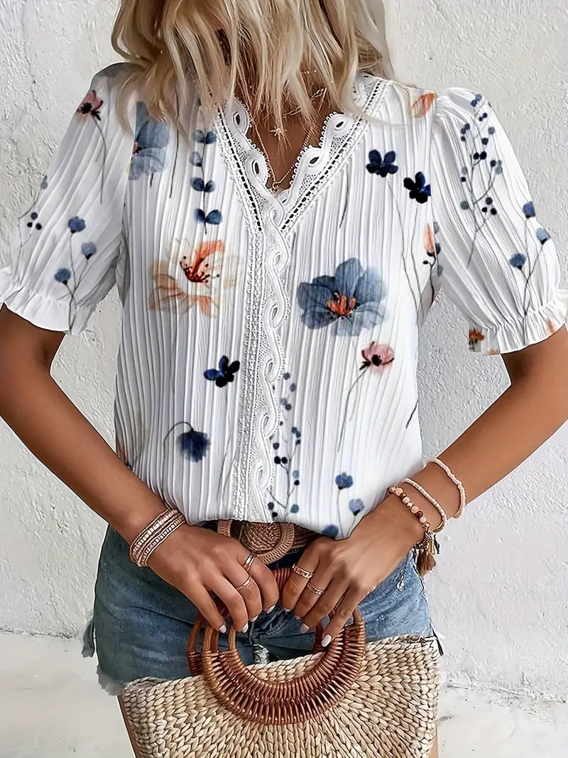 Introducing the Haven Stylish Floral Blouse, a perfect pick for your summer wardrobe! This blouse features a charming floral print with delicate lace trim detailing, adding a touch of elegance to your outfit. With its short puff sleeves, it's ideal for staying cool and fashionable during the summer months. Crafted with comfort in mind, this blouse is a versatile piece that can be dressed up or down for any occasion.
